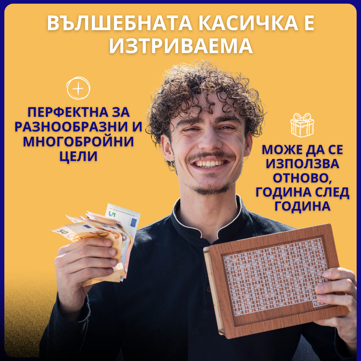 Спестяването никога не е било толкова удовлетворяващо. С всяко отбелязано квадратче върху вашата касичка виждате напредъка си и всеки ден се чувствате по-близо до своите мечти.