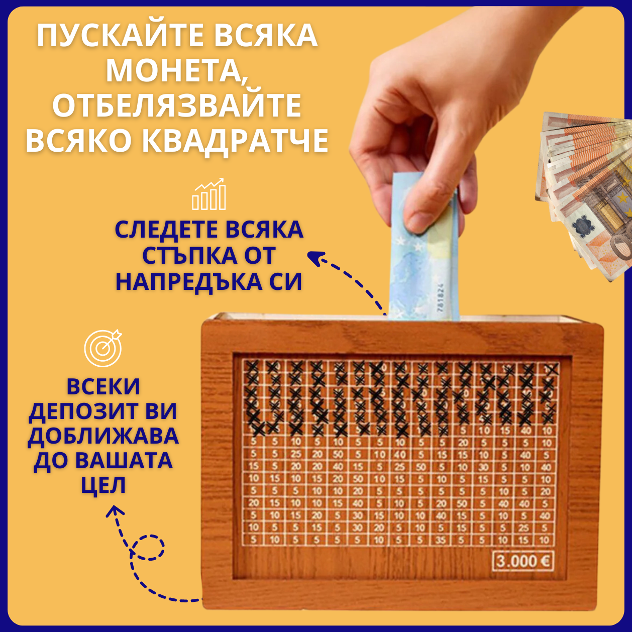 Отбелязвайте всяко квадратче, когато добавяте пари, и гледайте как се приближавате към целта си, монета по монета!